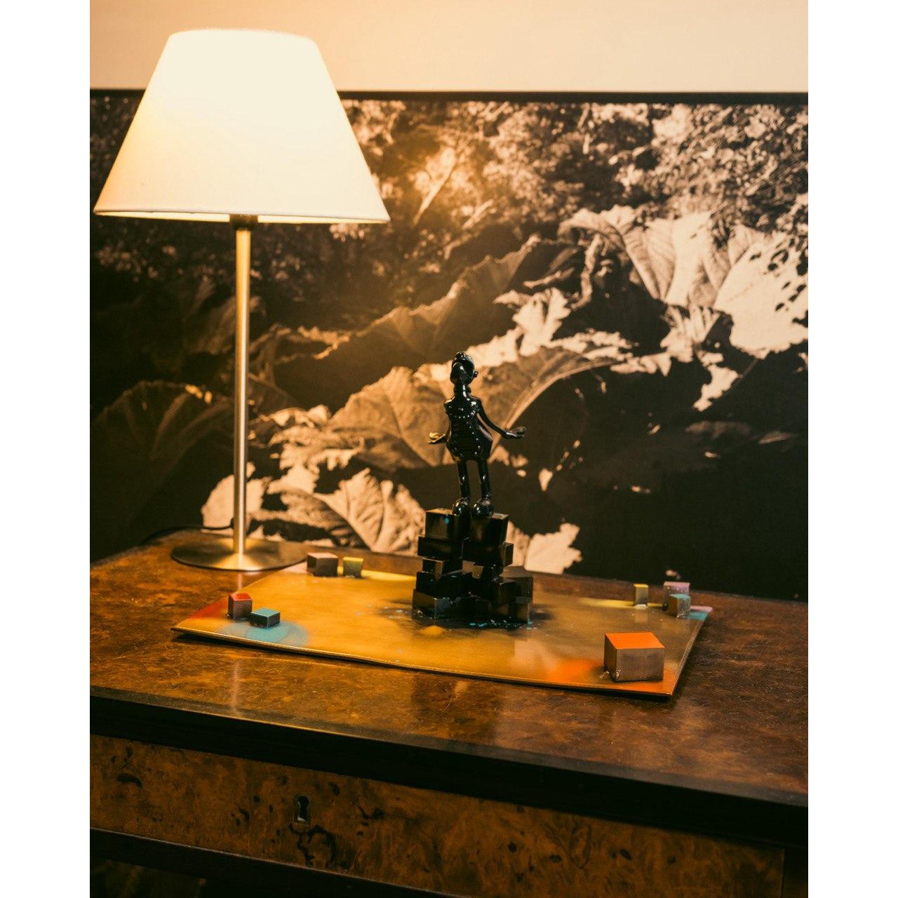 "L'Essere in Nero" è un opera che riflette sulla negatività interiore e il suo impatto sulla nostra vita. Al centro dell'opera, un omino è rappresentato sopra una pila di blocchi di ottone, tutti colorati di nero. Questo simboleggia il peso della negatività che portiamo con noi attraverso i nostri pensieri auto-limitanti. Intorno all'omino, invece, ci sono altri blocchetti in bronzo, dipinti con colori vivaci, che rappresentano le influenze esterne e le possibilità positive che esistono tra di noi. L'opera invita lo spettatore a riflettere sull'importanza di superare la negatività interna e ad abbracciare le opportunità e le esperienze positive che la vita ha da offrire.